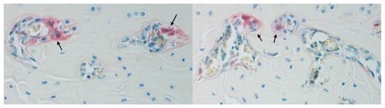 TRAP and toluidine blue staining of a Sprague-Dawley rat tibia, showing osteoclasts with positive TRAP staining (arrows) (female, 10–12 weeks of age, original magnification 400×).
