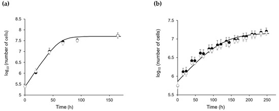 - Zwietering, M.H.; Jongenburger, I.; Rombouts, F.M.; van ’t Riet, K. Modeling of the Bacterial Growth Curve. Appl. Environ. Microbiol. 1990, 56, 1875–1881. [Google Scholar] [CrossRef]
