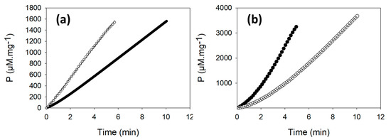 Representative progress curves of appearance of the product of the NADPH dependent GAPDH (a) and PRK (b) activities. The activity of the two enzymes was measured in the crude extract of WT-Cr (full circles) or of ∆CP12-Cr (empty circles) cells without pre-treatment with DTT. P corresponds to the product concentration in µmol·L−1 per mg of total proteins (µM·mg−1) in cell extracts. The quantity of proteins from WT-Cr and ΔCP12-Cr cell extracts used in the GAPDH activity assays were, respectively, 84 and 64 µg. In the shown PRK activity assays, 43 and 34 µg of proteins from WT-Cr and ∆CP12-Cr cell extracts were used. The experimental results are fitted to Equation (2) (Materials and Methods), except for the NADPH dependent GAPDH activity progress curve from the ∆CP12-Cr cell extract that is fitted to a straight line.