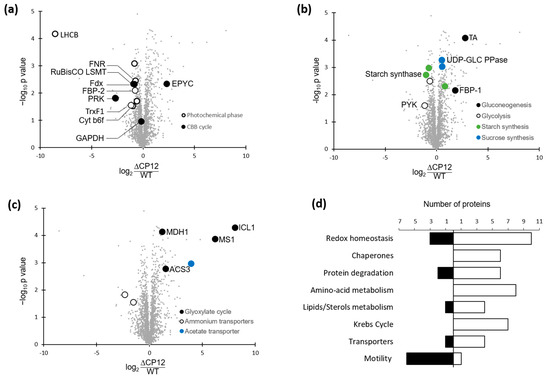 Differentially expressed proteins in ΔCP12-Cr vs WT-Cr strain. (a) Plot highlighting proteins related to photosynthesis metabolic pathways. The plot represents the fold changes in protein abundance. The x-axis shows difference of protein abundance in ΔCP12-Cr vs Wt-Cr (in log2). The y-axis shows the -log10 p value. The Volcano plot is available in Figure S2. (b) Plot highlighting proteins involved in carbohydrates related pathways. (c) Plot highlighting other metabolic pathways. (d) Number of proteins increasing or decreasing in abundance in ΔCP12-Cr strain, classified by selected metabolic pathways. The proteins that are more abundant in ΔCP12-Cr compared to WT-Cr are counted in the white bars, the proteins that are less abundant are counted in the dark bars. All the metabolic pathways are shown in Figure S3. LHCB, light-harvesting chlorophyll a/b-binding; FNR, Ferredoxin NADP+ Reductase; RuBisCO LSMT, RuBisCO large subunit methyltransferase; Fdx, ferredoxin; FBP, Fructose-1,6-bisphosphatase; TrxF1, Thioredoxin F1; Cyt b6 f, Cytochrome b6 f complex; EPYC, essential pyrenoid component 1; TA, transaldolase; UDP-GLC PPase, UDP-glucose pyrophosphorylase; PYK, pyruvate kinase; ICL1, Isocitrate Lyase 1; MS1, Malate synthase 1; MDH1, Malate dehydrogenase 1; ACS3, Acetyl-CoA synthetase 3.