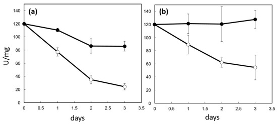 When the activity of GAPDH enzyme from the untreated WT-Cr cell extract was continuously monitored, the progress curve displayed a lag phase of about 1 min and a linear phase that corresponds to an activity of 168 ± 47 µM·min−1·mg−1 of proteins (Figure 2a and Table 1). The activity of the enzyme of the untreated samples was slightly lower (1.3-fold) than the one obtained with a pre-treatment of the cell extracts with 20 mM DTT (Table 1).