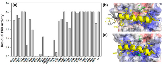 (a) Residual activity of PRK recovered after incubation with various CP12 mutants during three days at 4 °C (the absolute PRK activity without incubation is reported in Figure 4 and was 120 U·mg−1). The PRK activity was measured and compared with PRK activity of the enzyme incubated without CP12. Residual activity was determined as the ratio of the difference between PRK activity of the PRK-mutated CP12 mixture and of PRK alone. (b) Crystallographic structure of oxidized and inactive PRK in complex with CP12 in the ternary complex of A. thaliana GAPDH-CP12-PRK (pdb: 6 KEZ) [29]. (c) Structural model of A34–H47 helix from the C. reinhardtii CP12 (DOI: 10.5452/ma-cr3 y1) [32] docked onto the crystallographic structure of reduced and active C. reinhardtii PRK (pdb: 6 H7 G; [30]), based on the A. thaliana ternary complex (pdb:6 KEZ) as template. Blue: positively charged surface. Red: negatively charged surface.
