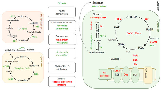 The abundances that were the most decreased correspond to proteins involved in the photochemical phase of photosynthesis. For example, the chlorophyll a/b binding protein of photosystem II (Cre17.g720250) decreased 375-fold. Proteins involved in electron transfer from photosynthesis to CBB cycle were also reduced, such as the ferredoxin NADP+ reductase (Cre11.g476750, 1.65-fold), the chloroplast ferredoxin (Cre14.g626700, 0.5-fold) and the thioredoxin F1 (Cre05.g243050, 2.26-fold).