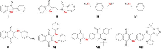 Ebselen (I) was among the first discovered Se heterocycles with potential antioxidant, anti-inflammatory, and GPx-like activities (Figure 1) [,,]. Furthermore, ethaselen (II) has recently entered clinical trial phase I as a potential organoselenium antitumor agent with minimal cytotoxicity in vivo []. Moreover, several organoselenocyanates (e.g., p-xylene selenocyanate (III) and benzyl selenocyanate (IV)) exhibited interesting chemoprotective properties towards different tumor models, such as colon, lung, and liver cancers (Figure 1) [,,,,,,,].