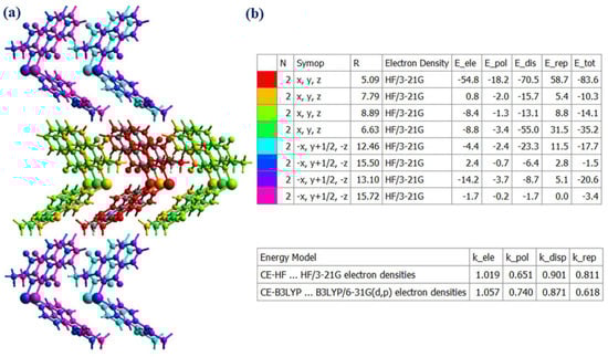(a) Chemical diagram for compound 5 (b) the color-coded interaction mapping within 3.8 Å of the centering molecule (grey) calculated with the CE-HF…HF/3-21G model.
