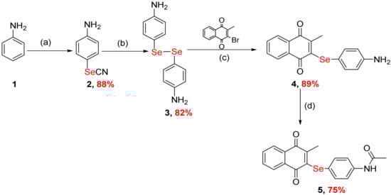 The synthesis of compound 5 was conducted from 4,4′-diselanediyldianiline (3) and 2-methyl-3-bromo-l,4-naphthoquinon as presented in Scheme 1 [,].