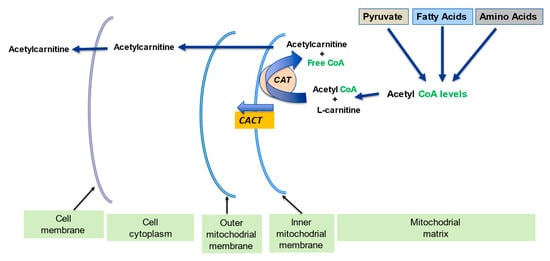 l-carnitine plays a part in the carrier of activated acetyl and acyl groups. In partnership with the carnitine transferase enzyme (CPT) and carnitine translocase (CACT), l-carnitine forms an effective transport system for acetyl groups (Figure 3) or acyl groups (Figure 7) out of the mitochondria, thus preventing diminution of intramitochondrial free CoA. The buffering of the acetyl-CoA and acyl-CoA levels is important in allowing CoA-dependent reactions, especially glycolysis and the pyruvate oxidation to continue optimally [2,13].
