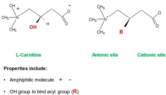 The amphiphilic nature of the l-carnitine molecule. Adapted from Virmani and Binienda, 2004 [20]. The unique amphiphilic nature of l-carnitine is attributed to the charges on its carboxyl and amine groups. The hydroxyl group gives it the ability to bind to fatty acids.