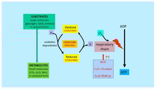 Substrates and nutrient cofactors in mitochondrial function and metabolic flexibility. Adapted from Virmani et al., 2013 [27]. Energy from starting substrates such as glycogen, lipids, and proteins are gradually extracted by the complex series of enzymes in the cellular cytoplasm and mitochondria, resulting in metabolites, mainly CO2 and H2O. Any dysfunction in this chain of events caused by lack of cofactors or mitochondrial dysfunction would lead to reduced ATP formation and increased ROS, Ca2+ and acyls buildup.