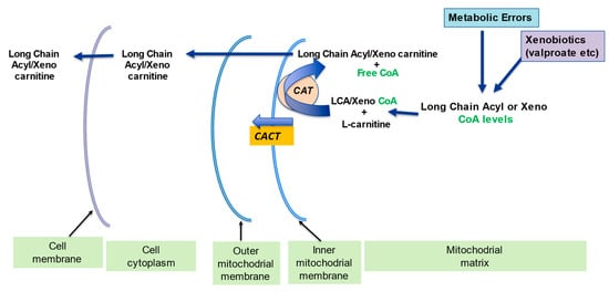 l-carnitine coupling decreases the number of long chain acyl residues attached to CoA and increases the free CoA to acyl-CoA’s ratio [9]. This process is essential in disorders of mitochondrial fatty acids oxidation where the fatty acyl-CoAs accrual in specific tissues such as in the heart and central nervous system can induce toxicity, trigger apoptosis and inflammation, and destabilize mitochondrial membrane [17,18]. For this reason, the conjugation of specific chain length acyls with l-carnitine creates very particular species of acylcarnitines that reflect any inborn errors of metabolism; thereby, they can also be utilized as markers for the screening of newborns [8,10].