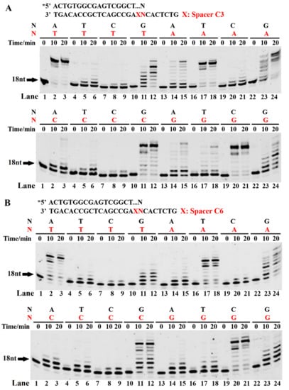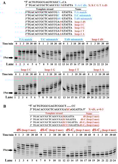 3.2. Incorporation of the First Nucleotide during Bypassing Spacer by Dbh