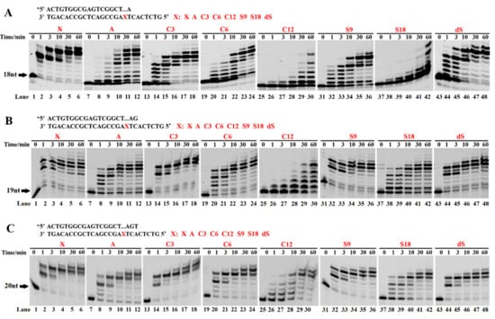 3.3. Incorporation of the First Nucleotide Downstream of AP Sites Was the Most Difficult