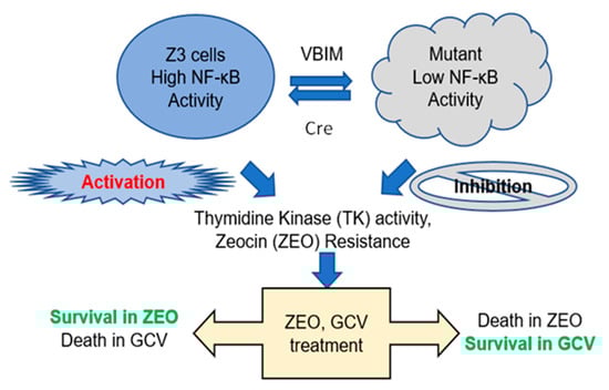 A schematic diagram for employing VBIM technology to select negative regulators of NF-κB is depicted in Figure 1. Briefly, starting with a previously published human embryonic kidney (HEK) 293-derived cell line (named Z3) with hyper NF-κB activity and NF-κB promoter-driven zeocin (ZEO) resistance gene and thymidine kinase (TK) gene [], we employed the innovative VBIM technique to randomly overexpress an unknown NF-κB negative regulator, thus generating mutant cells with low NF-κB activity. To select out these cells (low NF-κB activity), we split the cells into duplicate plates, followed by the treatment with either ganciclovir (GCV), a substrate of TK, or zeocin (ZEO). Consequently, cells with hyper NF-κB activity survive in ZEO and die in GCV (Left side), while cells harboring novel negative regulator of NF-κB, thus with low NF-κB activity, will die in ZEO and survive in GCV (Right side). With this approach, a mutant cell with overexpression of a novel NF-κB negative regulator can be identified and further expanded for further experiments.