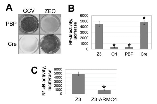 Using this system, as shown in Figure 2A, a mutant with low NF-κB activity died in ZEO and survived in GCV, while expression of Cre expression reversed this phenotype: The cells died in GCV and survived in ZEO. We then conducted an NF-κB-specific luciferase assay in Z3 parental cells, an original mutant (Ori), or a mutant infected with the PBP control vector (PBP) or with the vector expressing Cre (Cre). As shown in Figure 2B, both Ori and PBP cells had very low NF-κB luciferase activities, while Z3 parental cells had much higher NF-κB transactivation activity. Furthermore, the low NF-κB activity in the Ori mutant was reverted by the addition of Cre-recombinase. Collectively, data from Figure 2A,B show that the gene overexpressed in the VBIM clone regulates NF-κB activity negatively.