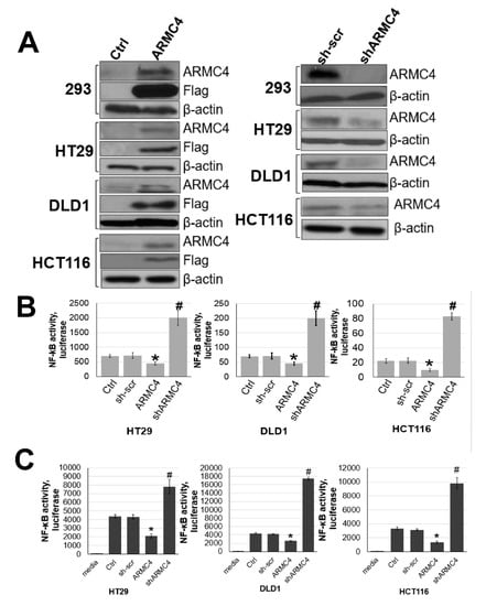 The human embryonic kidney (HEK) 293 cells, also referred to as 293 cells, were cultured in Dulbecco’s modified Eagle’s media (DMEM) supplemented with 100 U/mL penicillin, 100 mg/mL streptomycin, and 10% fetal bovine serum (FBS). HEK293 cells were previously described []. The HT29, DLD1, and HCT116 colon cancer cell lines were purchased from the American Tissue Culture Collection (ATCC) (Manassas, VA, USA) and were cultivated in RPMI1640 media with 100 U/mL penicillin, 100 μg/mL streptomycin, and 10% fetal calf serum. Experiments were carried out when the cells reached 90% confluence. The following antibodies were obtained from commercial sources: anti-ARMC4, anti-NF-κB p65, and anti-IκBα were from Santa Cruz Biotechnology, Inc. (Dallas, TX, USA). Anti-β-actin and anti-Flag were from Sigma-Aldrich (St. Louis, MO, USA).