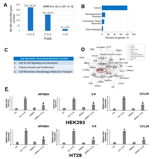 ARMC4 expression decreased NF-κB target gene expression. (A) An RNA-seq was conducted in the presence or absence of 10 ng/mL of IL-1β in HEK293 cells. Overexpression of ARMC4 decreased 56.3% (224 genes) of NF-κB target expression by 2-fold or more (ARMC4 + IL-1β/Ctrl + IL-1β ≤ 0.5), while leaving 39.2% (156 genes) unaffected (ARMC4 + IL-1β/Ctrl + IL-1β = 0.5–2), and merely 4.5% (18 genes) were increased by 2-fold or more (ARMC4 + IL-1β/Ctrl + IL-1β ≥ 2). Cells were treated or untreated with IL-1 β for 4 h before RNA was collected. (B–D) Ingenuity pathway analysis (IPA). IPA analysis identified near 80% of ARMC4-downregulated NF-κB target genes are cancer related (B), suggesting ARMC4’s important negative NF-κB regulation function in cancer. IPA also identified that ARMC4 has several top network cellular functions, including cell-cell signaling, proliferation, and cell morphology (C). Furthermore, IPA analysis identified a typical network that was regulated by ARMC4, in which NF-κB is at the hub of this network (D). (E) qPCR analysis of typical genes identified, confirming NFKBIA, IL-8, and CCL20 are NF-κB-inducible genes (+IL-1β condition) and were significantly downregulated by the overexpression of ARMC4 in both HEK293 (top row) and HT29 cells (bottom row) under IL-1β treatment. The data represent the means ± SD from three independent experiments. * p < 0.05 Ctrl + IL-1β vs. Ctrl group; $ p < 0.05 ARMC4 + IL-1β vs. Ctr + IL-1β group; n = 3.