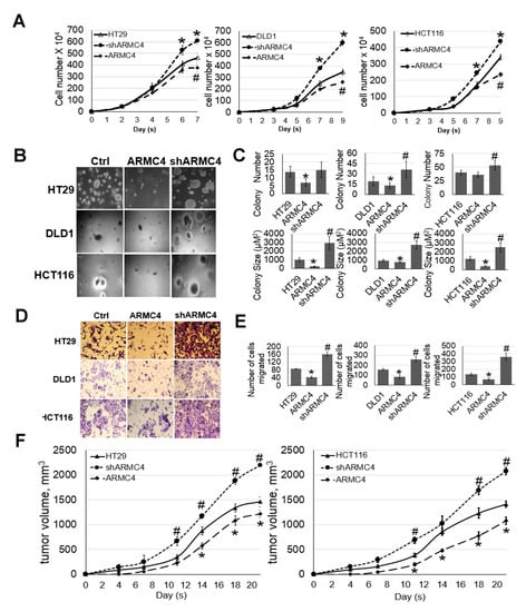 ARMC4 expression decreased cellular proliferation, migratory ability, anchorage-independent growth, and tumor growth. (A) Cell growth curve, showing that overexpression of ARMC4 inhibited cell growth compared with the Ctrl group, while shARMC4 knockdown greatly accelerated cell growth. * p < 0.05 ARMC4 vs. Ctrl group; # p < 0.05 shARMC4 vs. Ctrl group. (B,C) Anchorage-independent growth (Soft agar assay), showing ARMC4 overexpression cells exhibited dramatically decreased colony size and number compared with Ctrl cells. shARMC4 CRC cells showed increased colony size and number compared with Ctrl cells. * p < 0.05 ARMC4 vs. Ctrl group; # p < 0.05 shARMC4 vs. Ctrl group. (D,E) Migration assay using Boyden chamber wells, showing overexpression of ARMC4 decreased migratory ability of CRC cells compared to the Ctrl cells. In contrast, shARMC4 cells had remarkably increased migratory ability. * p < 0.05 ARMC4 vs. Ctrl group; # p < 0.05 shARMC4 vs. Ctrl. (F) Tumor growth of cells in an NSG mouse sub-cutaneous xenograft model, showing ARMC4 overexpression, led to decreased tumor growth compared to the Ctrl. shARMC4 led to significantly increased tumor growth compared to the Ctrl. * p < 0.05 ARMC4 vs. Ctrl group; # p < 0.05 shARMC4 vs. Ctrl group. n = 3 independent experiments for all experiments described here.