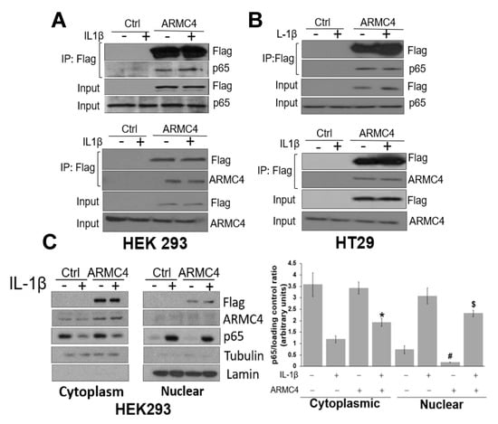 ARMC4 may complex with the p65 subunit of NF-κB. Co-IP experiments, showing ARMC4 may form a complex with the p65 subunit of NF-κB ((A,B) top panels). Co-IP experiments in HEK293 cells ((A) top panel) or HT29 cells ((B) top panel) were performed with or without co-expression of Flag-tagged ARMC4. Cells were treated or untreated with IL-1β for 1 h. Flag-ARMC4 was then pulled down with anti-Flag agarose beads. Samples were then subjected to Western analysis probed with anti-p65 antibody and anti-Flag antibody to detect the co-IP of ARMC4 and p65. For inputs, anti-Flag antibody was used to detect Flag-ARMC4; anti-p65 antibody was used to show the input of total p65. Similarly, co-IP experiments, showing p65 may form a complex with ARMC4 ((A,B) bottom panels). Co-IP experiments in HEK293 cells ((A) bottom panel) or HT29 cells ((B) bottom panel) were performed with or without co-expression of Flag-tagged p65. Experimental procedures are similar to those of top panels. For inputs, anti-Flag antibody was used to detect Flag-p65; anti-ARMC4 antibody was used to show the input of total ARMC4 (C) Cell fractionation experiment, showing localization of HEK293 cells control and overexpressing Flag-tagged ARMC4 cells to both the cytoplasm and nucleus. ARMC4 localized mostly to the cytoplasm, and ARMC4 overexpression reduced translocation of p65 to the nucleus. Tubulin and lamin were used as loading controls for cytoplasmic and nuclear fractions, respectively. ((C) right panel) Image J quantification of p65 to loading controls (tubulin and lamin) ratios for three independent Western blots is shown. * p < 0.05 cytoplasmic HEK293-ARMC4 + IL1β vs. cytoplasmic HEK293, # p < 0.05 nuclear HEK293-ARMC4 vs. nuclear HEK293, $ p < 0.05 nuclear HEK293-ARMC4 + IL1β vs. nuclear HEK293 + IL1β.