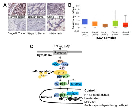 ARMC4 expression is decreased in CRC patient specimens. (A) Tissue microarray (TMA) using ARMC4 antibody as the probe, showing strong expression of ARMC4 in normal tissue, while significantly decreased expression in different stages of CRC and the metastasized patient tumor samples. (B) Data gathered from TCGA databases, showing ARMC4 transcripts trend toward decreased levels in different stages of CRC as compared to normal samples. (C) Hypothetical model, suggesting that ARMC4 may form a complex with the NF-κB, thus exert negative regulation effect on the hallmarks of cancer regulated by NF-κB. In traditional pathway, upon cytokine stimulation, the IκB kinase phosphorylates IκBα, causing degradation of IκB. The free p65/p50 heterodimer then migrates to the nucleus to bind to κB-binding sites on the promoters of specific genes, leading to their activation. Our findings suggest ARMC4 may complex with NF-κB downstream of IκBα, therefore decreasing NF-κB activity and reducing cellular proliferation, migration, and anchorage-independent growth ability as well as tumor growth in vivo.