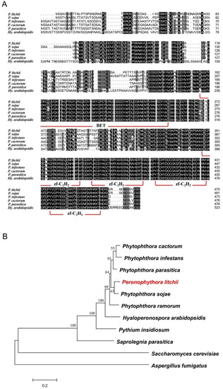 Domain arrangement and phylogenetic analysis with PlCZF1 protein and its orthologs. (A) Protein sequence alignment of PlCZF1 and its orthologs from Phytophthora infestans, Phytophthora sojae, Phytophthora cactorum, Phytophthora parasitica and Hyaloperonospora arabidopsidis. Columns with identical and similar amino acid sequences were colored with black and gray, respectively. The regions of BET and Znf-C2H2 were indicated. (B) Phylogenetic analysis of CZF1 proteins of P. litchii and other oomycetes and fungi. Phylogenetic dendrograms were constructed by MEGA 7.0, with the Neighbour-Joining method using 1000 bootstrap replications.