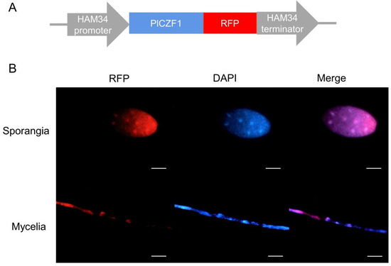 Subcellular localization of PlCZF1. (A) The illustration of the construct produced for PlCZF1 localization. (B) The hypha and sporangia of the fluorescent transformants of P. litchii were observed under a fluorescence microscope during red fluorescence (RFP) and DAPI (blue) staining. The scale of the sporangium stage is 5 μm, and the scale of the hyphae stage is 10 μm.