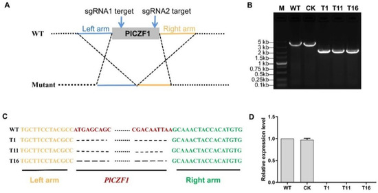 CRISPR/Cas9-mediated knockout of PlCZF1. (A) Two single guide RNAs targeting the two sides of the PlCZF1 coding region were designed to disrupt PlCZF1. (B,C) Three independent deletion mutants were identified by genomic PCR and confirmed by sequencing. (D) Relative expression levels of PlCZF1 were determined by qRT-PCR in WT, CK, T1, T11 and T16. The constitutive expression of PlActin was used as a reference gene. Expression levels were normalized using the WT values as ‘1’. Data represent means ± SD from three independent biological repeats.