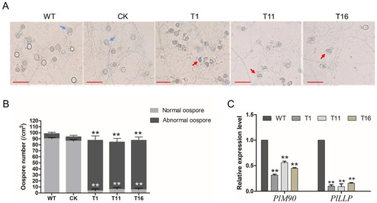Deletion of PlCZF1 produced many aborted oospores. (A) Morphology of oospores produced in 17 days old cultures of WT, CK and Δplczf1 mutants. Blue arrows indicate the normal oospore and red arrows indicate the abnormal oospore. The bars indicate 20 μm. (B) Amount of normal and aborted oospores produced by WT strain, control strain and the aborted mutants. Data represent means ± SD from three independent biological repeats, and asterisks indicate significant differences (** p < 0.01 compared with WT, Dunnett’s test). (C) The relative expression level of PlM90, PlLLP in Δplczf1 mutants. The constitutive expression of PlActin was used as reference gene. Data represent means ± SD from three independent biological repeats, and asterisks denote significant differences from the control group (Student’s t test: ** p < 0.01).