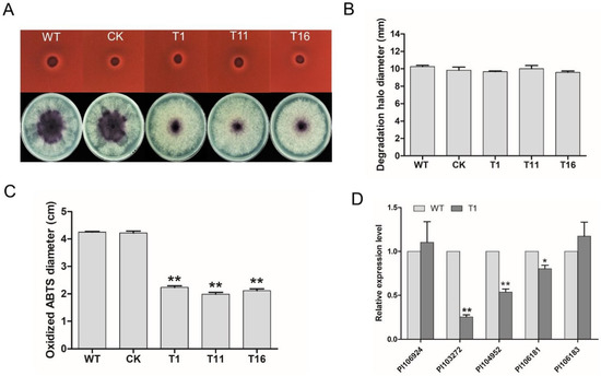 Detection of extracellular peroxidase and laccase activity in PlCZF1 deletion mutants. (A) Peroxidase and laccase activity assay. For peroxidase activity assay, mycelial mats of WT, CK and three PlCZF1 deletion mutants were inoculated onto solid Plich medium containing Congo red at a final concentration of 500 g/mL for 1 day; For laccase activity assay, mycelial mats of the aforementioned strains were inoculated on lima bean agar (LBA) media containing 0.2 mM ABTS for 10 days. (B) The discoloration halo diameters were measured at 1 day post-inoculation. (C) The diameters of oxidized ABTS (dark purple) were measured at 10 days post-inoculation. Different letters bar charts represent a significant difference (p < 0.05) based on Duncan’s multiple range test method. These experiments contained three independent biological repeats, each of which contained three replicas. (D) The transcript levels of putative peroxidase-encoding genes and laccase-encoding genes in T1 and WT strain. The constitutive expression of PlActin was used as a reference gene. Data represent means ± SD from three independent biological repeats, and asterisks denote significant differences from the control group (Student’s t-test: * p < 0.05; ** p < 0.01).