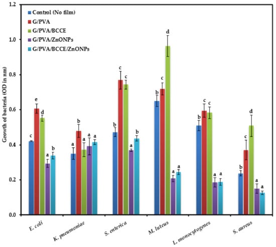 Hence, we can suggest that the cell wall composition critically determines the ZnONP resistance between the two bacterial groups, making Gram-negative bacteria more resistant to ZnONPs than Gram-positive bacteria. Moreover, a significant increase in the growth of Gram-positive bacteria in the presence of extracts (G/PVA/BCCE) was seen. This is in line with our previous study where higher growth of the three Gram-positive bacterial strains was recorded in gelatin films enriched with different concentrations of water and methanolic extracts of rapeseed meal, and the growth increased with increasing concentrations of rapeseed meal extract [].