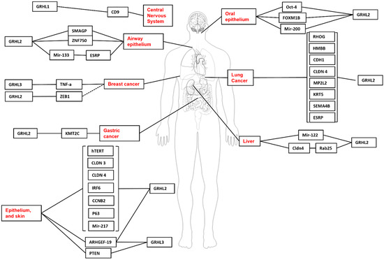 | Octamer-binding transcription factor 4, (OCT-4) | Human | Grhl2 binds to the proximal region of the Oct-4 promotor, putatively regulating the transcription of Oct-4 in cell reprogramming and contributing to oral cell carcinoma. | [93] |
