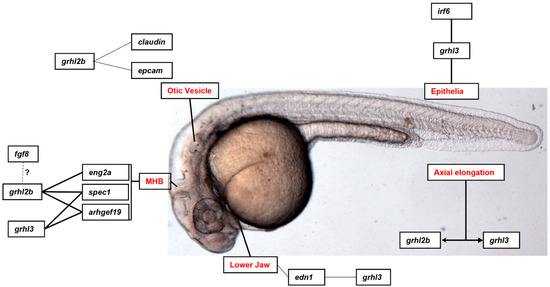 - Dworkin, S.; Darido, C.; Georgy, S.R.; Wilanowski, T.; Srivastava, S.; Ellett, F.; Pase, L.; Han, Y.; Meng, A.; Heath, J.; et al. Midbrain-hindbrain boundary patterning and morphogenesis are regulated by diverse grainy head-like 2-dependent pathways. Development 2012, 139, 525–536. [Google Scholar] [CrossRef] [PubMed]