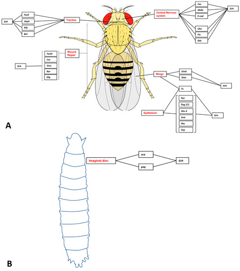 - Mace, K.A.; Pearson, J.C.; McGinnis, W. An Epidermal Barrier Wound Repair Pathway in Drosophila Is Mediated by grainy head. Science 2005, 308, 381–385. [Google Scholar] [CrossRef]
