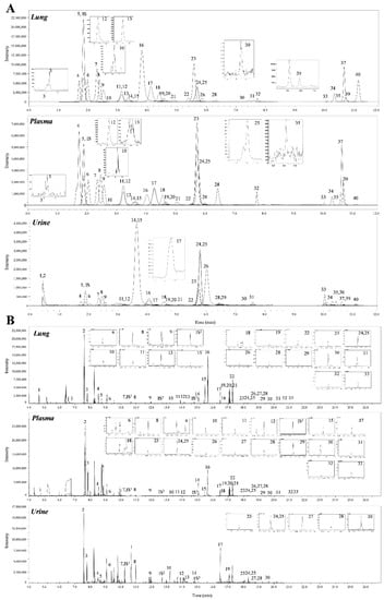 From each group, 10 animals were used for the sample collection. The urine sample was collected from an individual mouse prior to necropsy according to standard procedure []. Fresh urine samples were clarified by centrifugation at 3000 rpm for 5 min at 4 °C. After urine collection, the mice were anesthetized with an overdose of isoflurane (Hana Pharm Co., Ltd., Hwa-Sung, Korea), and blood samples (approximately 0.5 mL) were collected from the posterior vena cava of mice using a 26-gauge syringe from each mouse. The whole blood samples were collected into complete blood count bottles containing EDTA-2K (BD, Franklin Lakes, NJ, USA) and centrifuged at 3000 rpm for 10 min at 4 °C to separate the plasma. The lung was removed and then weighed immediately after collection of full blood samples. The urine, plasma, and lung samples were frozen in liquid nitrogen and stored at −80 °C until analysis.