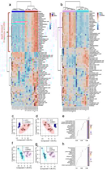 Hierarchical clustering heatmap (a), PCA scores plot (c), PLS-DA scores plot (d), and VIP score of top-15 metabolites in PLS-DA (e) of lung in COPD1 and VC1 groups. Hierarchical clustering heatmap (b), PCA scores plot (f), PLS-DA scores plot (g), and VIP score of top-15 metabolites in PLS-DA (h) of lung in COPD2 and VC2 groups.