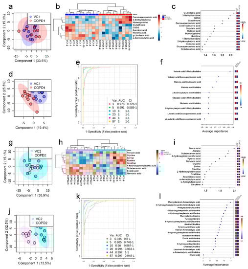 PCA scores plot (a), hierarchical clustering heatmap of 9 significant metabolites (b), VIP score of top-15 metabolites in PLS-DA (c), PLS-DA scores plot (d), multivariate ROC curve analysis (e), average importance of 10 metabolite combination in multivariate ROC curve analysis (f) of plasma in COPD1 and VC1 groups. PCA scores plot (g), hierarchical clustering heatmap of 9 significant metabolites (h), VIP score of top-15 metabolites in PLS-DA (i), PLS-DA scores plot (j), multivariate ROC curve analysis (k), average importance of 20 metabolite combinations in multivariate ROC curve analysis (l) of plasma in COPD2 and VC2 groups.