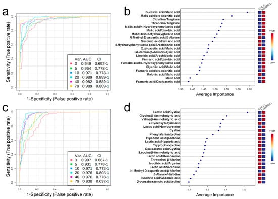 Multivariate ROC curve analysis (a), average importance of metabolite combinations of 20 types in multivariate ROC curve analysis (b) of urine in COPD1 and VC1 groups. Multivariate ROC curve analysis (c), average importance of metabolite combinations of 20 types in multivariate ROC curve analysis (d) of urine in COPD2 and VC2 groups.