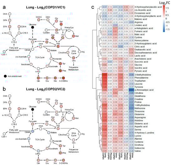 Metabolic pathway maps of lung in COPD1 (a) and COPD2 (b) groups. Hierarchical clustering heatmap of lung, plasma, and urine in COPD1 and COPD2 groups (c). An indicator expressing the value of Log2FC in color (red; increase and blue; decrease) was used in the comparison of COPD1 and COPD2 with VC1 and VC2, respectively.