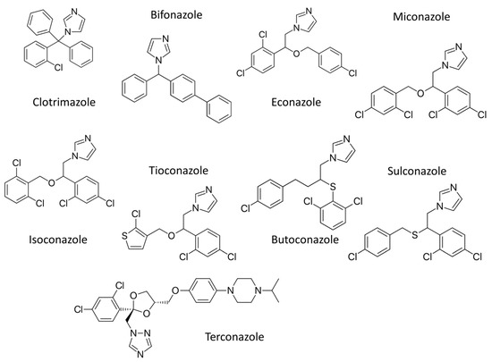 The most common antifungal drugs for topical application from the azole class [7] include derivatives of imidazole (clotrimazole, bifonazole, econazole, miconazole, isoconazole, tioconazole, butoconazole, and sulconazole) and derivatives of 1,2,4 –triazole (terconazole) (Figure 2). The mechanism of activity for the drugs from azole class is the inhibition of the ergosterol synthesis by direct binding to sterol 14α-demethylase (CYP51). The enzyme CYP51 is present in the endoplasmic reticulum outer membrane and its role is catalyzation of the removal of the methyl group at carbon 14.
