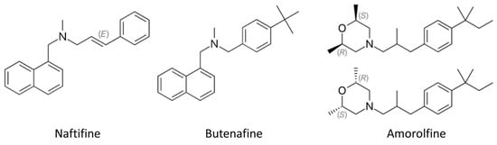 Chemical structure of antifungal amines used for topical applications. (E)—trans isomer, (S)—sinister enantiomer, (R)—rectus enantiomer.