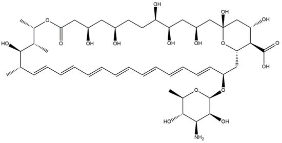 Amphotericin B (Figure 4) is, like nystatin, a polyene macrolide antifungal drug. It was obtained from a culture of the fungus Streptomyces nodosus. The mechanism of action is identical to the mechanism of action of nystatin—interaction with ergosterol in the fungal membrane by creating pores in the cell membrane [24]. Amphotericin B interacts with the membrane lipid bilayer through its hydrophobic domains, which induces formation of multimeric pores along with subsequent increase in the permeability of ions (K+, Ca2+, and Mg2+). Eventually, intracellular loss induces cell death [25]. On the other hand, it is also suggested that Amphotericin B is mainly in the form of large, extramembranous aggregates that extract ergosterol from lipid bilayers as its antifungal mechanism. It is proposed that extraction of the essential cell lipid underlies the antifungal action of this compound [26].
