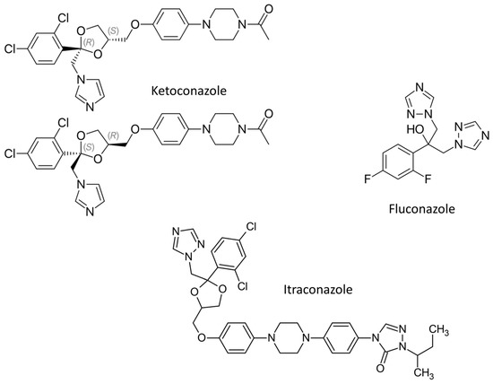 Chemical structure of azole derivatives used as systemic antifungal drugs. (S)—sinister enantiomer, (R)—rectus enantiomer.