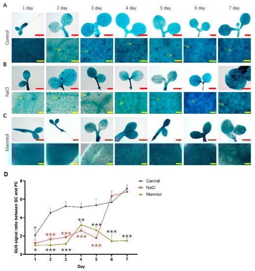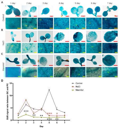 2.5. Drought and Salt Stress Regulate the Developmental Patterns of GCs and PCs through PIFs