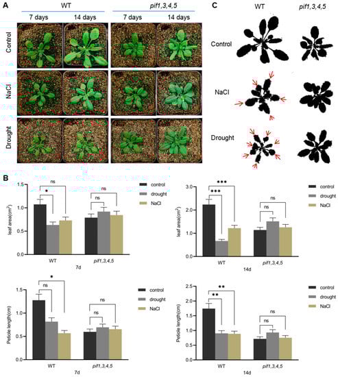 3.2. Light Signaling Is Involved in Regulating Leaf Development under Drought and Salt Stress Conditions