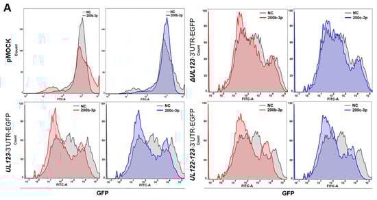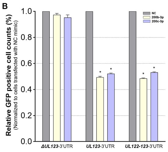 We generated SCs using an EGPF plasmid harboring mutated oligonucleotides corresponding to the predicted miR-200b-3p- and miR-200c-3p binding sequences within the 3′-UTR of UL123 (ΔUL123-3′-UTR SCs) (Table 1). The ΔUL123-3′-UTR SCs that were not transiently transfected with miRNA mimics or infected with HCMV also expressed GFP (Figure 1C,D). Then, we transiently transfected ΔUL123-, UL123-, or UL122-123-3′-UTR-SCs with miRNA-200b-3p or miR-200c-3p mimics for 2 days. Exogenously provided miR-200b-3p and miR-200c-3p significantly decreased the numbers of GFP-positive UL123- and UL122-123-3′-UTR SCs (all p < 0.001) after normalization to those in NC cells transfected with the mimic (Figure 2A,B). However, treatment with exogenous miR-200b-3p or miR-200c-3p in the ΔUL123-3′-UTR SCs or pMOCK did not affect GFP-positive cells (Figure 2A,B).