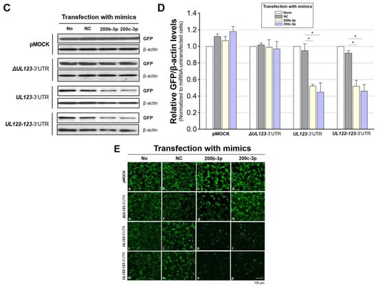 Immunoblotting findings also revealed that exogenous miR-200b-3p and miR-200c-3p reduced GFP expression compared with the transfected NC mimic in UL123-3′-UTR and UL122-123-3′-UTR SCs (Figure 2C). The GFP/β-actin values were normalized to cells that were not transfected with the mimic (all p < 0.001; Figure 2D). However, GFP levels in the ΔUL123-3′-UTR SC and pMOCK did not differ among cells transfected with NC mimic, miR-200b-3p mimic, or miR-200c-3p mimic (Figure 2C,D). The expression of GFP was similar to that determined by flow cytometry and immunoblotting (Figure 2E). The GFP fluorescence was less intense in UL123- (Figure 2E, panels k and l) and UL122-123-3′-UTR SCs (Figure 2E, panels o and p) transfected with miR-200b-3p or miR-200c-3p mimic compared with those in mutant UL123-3′-UTR SCs (Figure 2E, panel g and h). Overall, miR-200b-3p and miR-200c-3p bound to the 3′-UTR of HCMV UL123, and the 3′-UTR of UL122 had ≈50% of the reported binding affinity [,].