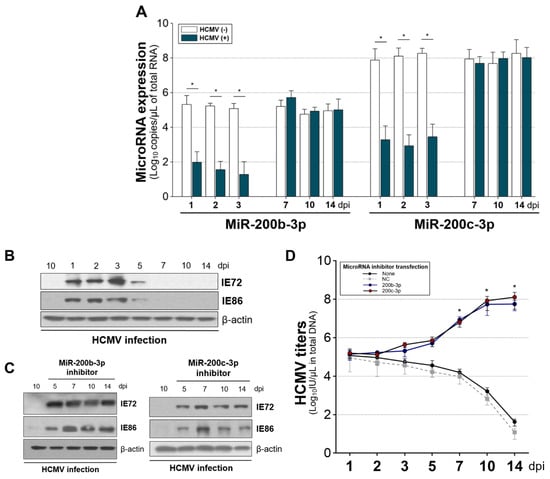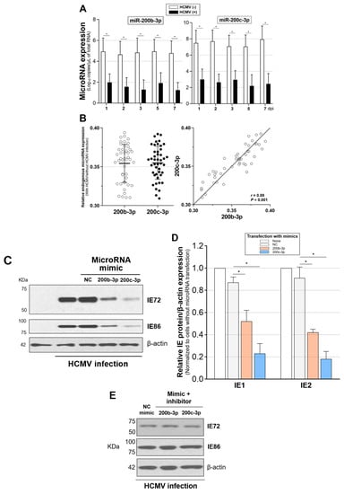 Abundant IE72 and IE86 are generally synthesized at 2–3 dpi in permissive cells infected with a laboratory-adapted HCMV strain [,,,]. We also found abundant IE72 and IE86 expression at 2 dpi in the nuclei of HFF-1 cells infected with the HCMV Towne strain at an MOI of 0.1 (Figure S3). According to these findings, we measured IE72 and IE86 levels as well as HCMV titers at 2 dpi after transient transfection with miR-200b-3p or miR-200c-3p mimics under the same conditions in vitro [].