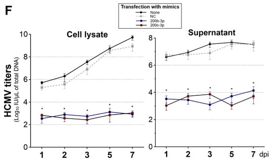 Since the major IE proteins play essential roles in continuous lytic replication and progeny HCMV production [,,,,,,,,,], miR-200b-3p and miR-200c-3p, which suppress IE72 and IE86 synthesis via post-transcriptional modification, should restrict active HCMV replication. We found that miR-200b-3p and miR-200c-3p mimic significantly reduced HCMV titers in cell lysates (−log10 (4.1 ± 1.5) and −log10 (4.4 ± 1.3) IU/µL) and in supernatants (−log10 (3.5 ± 1.2) and −log10 (3.5 ± 1.6) IU/µL) (three independent measurements each with three replicates of lysates or supernatants each at 1, 2, 3, 5, and 7 dpi) compared with NC mimic-transfected cells at 1, 2, 3, 5, and 7 dpi (all p < 0.001) (Figure 3F). These results showed that miR-200b-3p and miR-200c-3p directly downregulate the expression of IE72 and IE86, which is a phenomenon that results in inhibited HCMV replication.