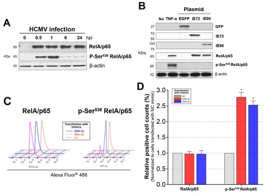 Nuclear factor light-chain-enhancer of activated B cells (NF-κB) is rapidly activated and binds to the MIE promoter (MIEP)—a potent transactivator element of genes encoding the IE proteins that harbors four NF-κB-binding motifs—during early productive HCMV replication. NF-κB also regulated the expression of other viral genes such as UL144 [,,,,,,]. Rapid induction of the NF-κB signaling pathway in response to HCMV entry is essential for the induction of IE expression, the lytic cascade of progeny virus production, and reactivation of latently infected undifferentiated cells [,,,,,]. This initial increase in nuclear NF-κB activity can be attributed to the release of cytoplasmic interacting partners of NF-κB, i.e., RelA/p65 and p50, and results in the sustained expression of IE genes [,]. Phosphorylation of the RelA/p65 domain at the serine 536 (Ser536) residue significantly impacts the stability and protein interactions of NF-κB via a conformational change, and it enhances NF-κB transactivation in response to infection with microbes [,,,,,], but this is not known in HCMV infection. Moreover, changes in the NF-κB signaling pathway induced by cellular hsa-miRs during HCMV infection remain unknown. Therefore, we explored the effects of changes in hsa-miRs during HCMV infection on the phosphorylation of RelA/p65 (Ser536) to understand how cellular miRNAs are involved in modulating host signaling after HCMV entry.