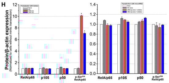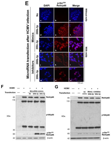 We investigated whether recovery of the downregulated endogenous miR-200b-3p and miR-200c-3p, which can decrease IE72 and IE86 protein, changes p-Ser536 RelA/p65 during acute lytic HCMV replication. Numerous miR-200b-3p- or miR-200c-3p-mimic-transfected and HCMV-infected cells exhibited high levels of p-Ser536 RelA/p65 at 2 dpi; these levels were as high as those observed in RelA/p65-positive cells (Figure 6C,D). However, significantly fewer cells were p-Ser536 RelA/p65-positive among those transfected with NC mimic (all p < 0.001, Figure 6C,D). In contrast, further downregulation of miR-200b-3p and miR-200c-3p using inhibitors resulted in a significant reduction in the levels of nuclear and cytoplasmic p-Ser536 RelA/p65 (Figure 6E, panels l or o) compared with that in cells transfected with an miR-200b-3p mimic (Figure 6E, panel f) or miR-200c-3p mimic (Figure 6E, panel i). Towne strain-infected HFF-1 cells transfected with miR-200b-3p and miR-200c-3p mimics expressed significantly more p-Ser536 RelA/p65 than HFF-1 cells without mimics or with NC mimic transfection but did not alter the levels of RelA/p65 or p105/p50 protein (Figure 6F,H-left panel). Restoring the levels of endogenous miR-200b-3p and miR-200c-3p through inhibitor transfection 1 h after simultaneous HCMV infection and mimic transfection decreased p-Ser536 RelA/p65 expression to the minimal levels (Figure 6G,H-right panel). These findings indicated that abundant miR-200b-3p or miR-200c-3p expression leads to post-transcriptional inhibition of IE72 and IE86 expression and that this is associated with the induction of p-Ser536 RelA/p65 expression.