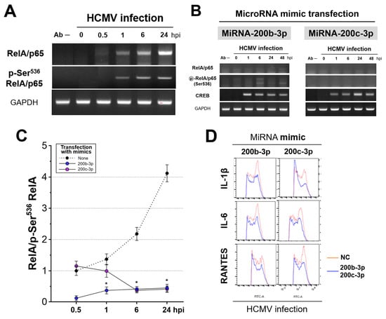 Nuclear factor−kappa B RelA/p65 phosphorylated at Ser536 bound to MIEP enhancer region and upregulated miR-200b-3p and miR-200c-3p led to increased p-Ser536 RelA/p65 binding to MIEP and decreased pro-inflammatory cytokine expression. We amplified the MIEP enhancer region by PCR in two cell groups after ChIP with RelA/p65 and p-Ser536 RelA/p65 mAbs. HFF-1 cells infected with HCMV Towne strain (MOI of 0.1) without (A) and with (B) miR-200b-3p or miR-200c-3p mimic transfection at indicated time points. (C) Band intensity of NF-κB RelA/p65 and p-Ser536 RelA/p65 is expressed as the ratio of amplified DNAs. (D) The expression of IL-1β, IL-6, and RANTES (CCL5) at 2 dpi in HFF-1 cells infected with the HCMV Towne strain and in those transfected with miR-200b-3p, miR-200c-3p, and NC mimic measured by flow cytometry. Dots and error bars indicate means and SEM, respectively. * p < 0.001 vs. cells without transfected microRNA mimic.